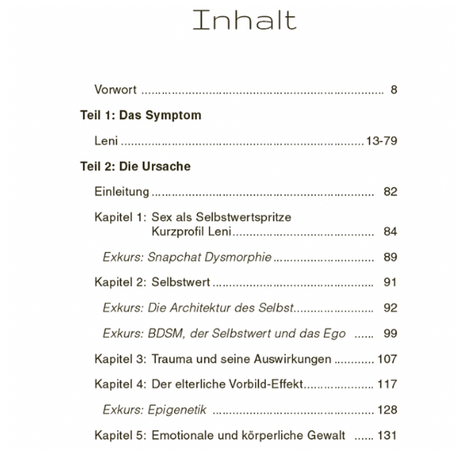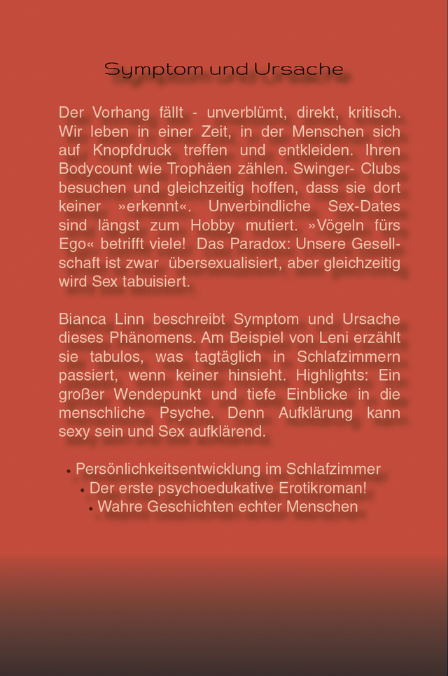 Wir leben in einer Zeit, in der Menschen sich auf Knopfdruck treffen und entkleiden. Ihren Bodycount wie Trophäen zählen, Swinger-Clubs besuchen und gleichzeitig hoffen, dass sie dort keiner „erkennt“. Unverbindliche Sex-Dates sind längst zum Hobby mutiert. Dieses Fachbuch verbindet erotische Literatur mit Psychologie, basiert auf wahren Ereignissen und zeigt authentisch und lebensnah, wie stark Ego, Selbstwert und emotionale Verletzungen auf unser Liebes- und Sexleben wirken, unter anderem.: